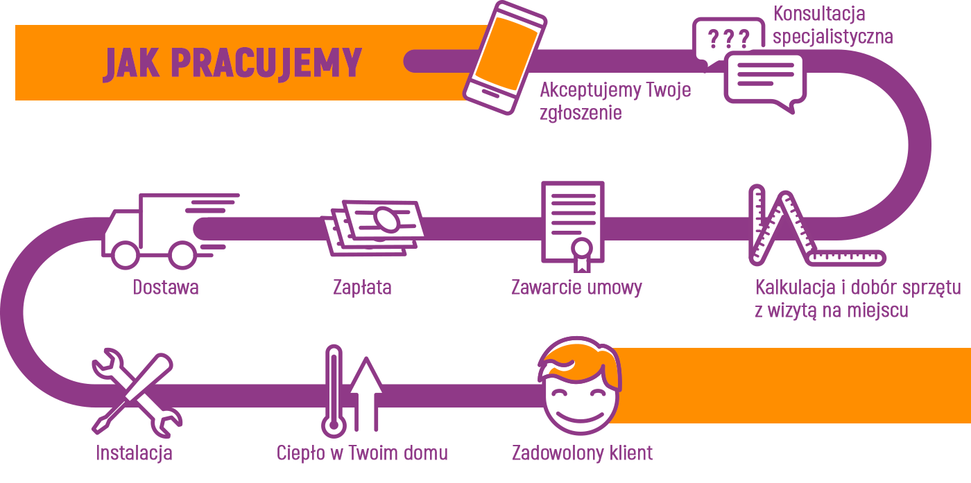 Wyślij zapytanie na stronie lub telefonicznie – Oddzwonimy i doradzimy – W razie potrzeby pojedziemy na miejsce – Dokonamy bezpłatnej wyceny – Zawrzemy z Tobą umowę – Ty dokonujesz płatności – My dostawa i montaż instalacji grzewczej – Jest Ci ciepło i masz świetny humor